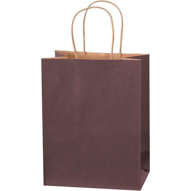 Square bottoms allow bags to stand alone for convenient packaging. Twisted paper handles make carrying multiple purchases easy. Features kraft interior and brown tinted exterior.
