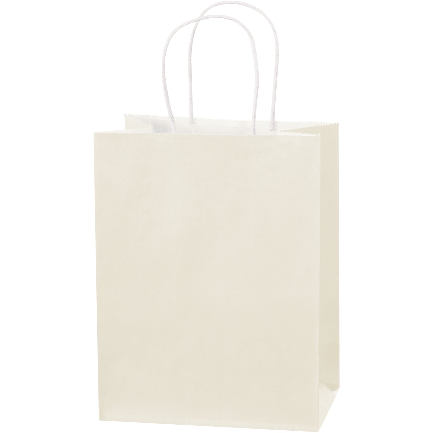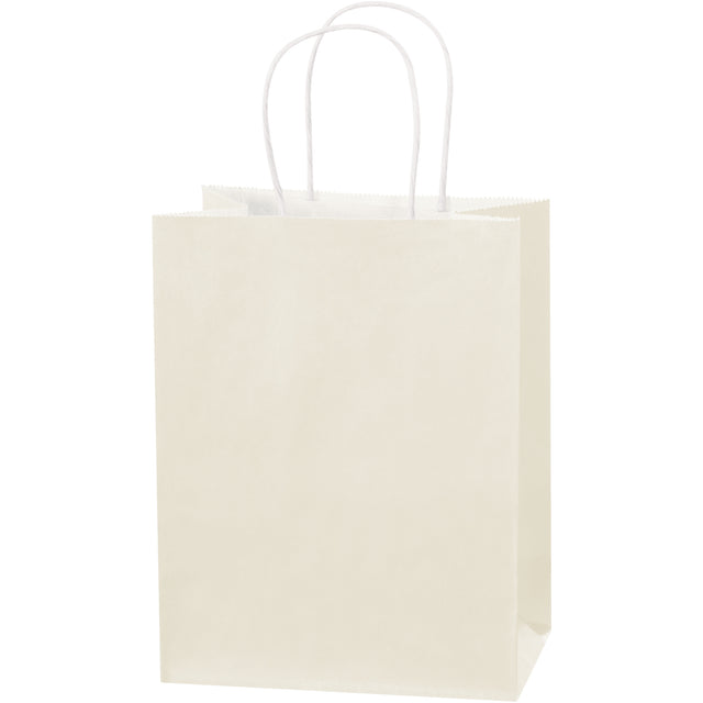 Square bottoms allow bags to stand alone for convenient packaging. Twisted paper handles make carrying multiple purchases easy. Features white interior and french vanilla tinted exterior.