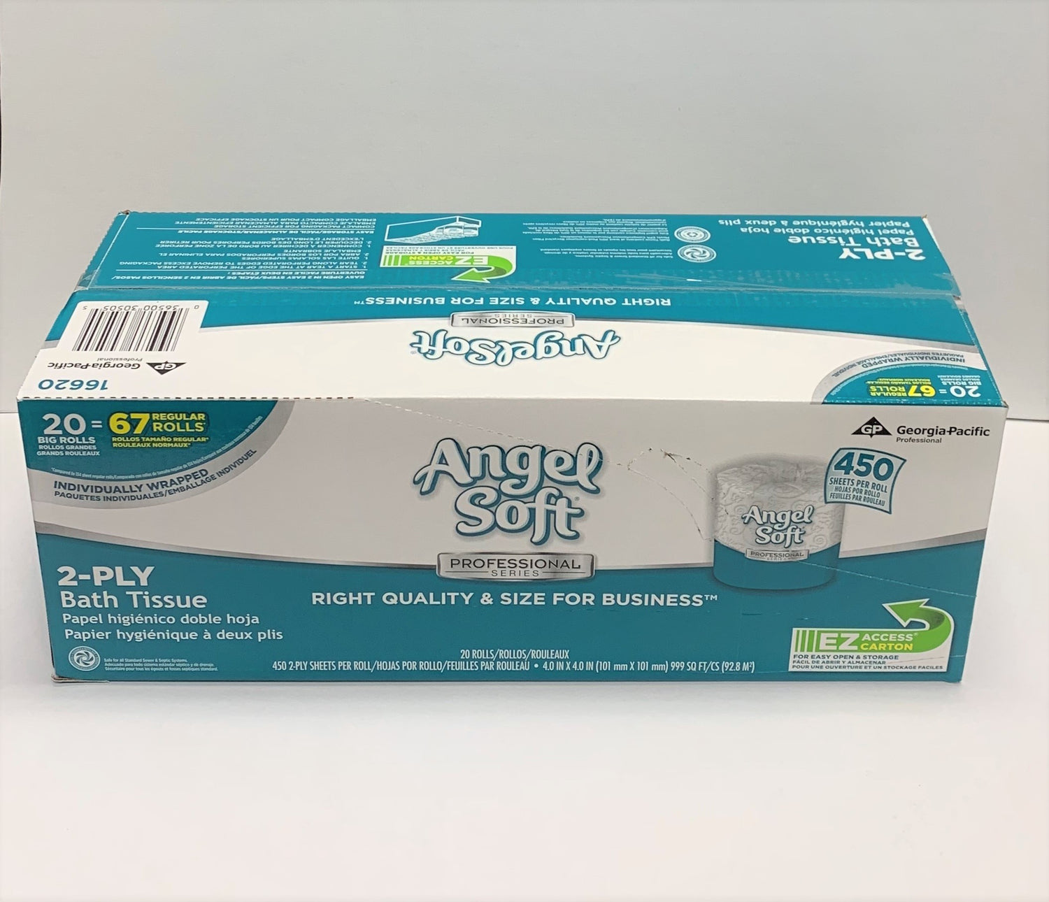 This case of Angel Soft two ply toilet paper has 450 sheets per roll and 20 rolls per case. Could also substitute Cottonelle.