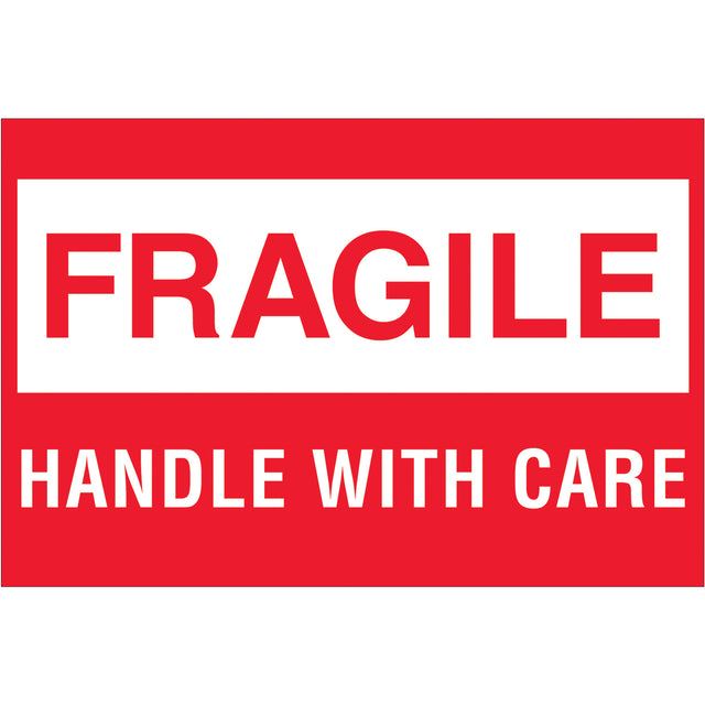2 x 3" - "Fragile - Handle With Care" is backordered and will ship as soon as it is back in stock.