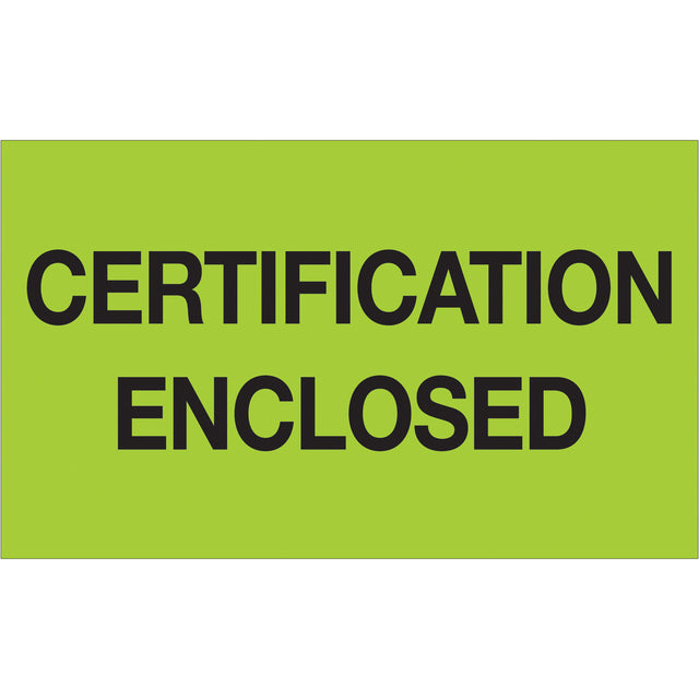 3 x 5" - "Certification Enclosed" (Fluorescent Green) Labels
