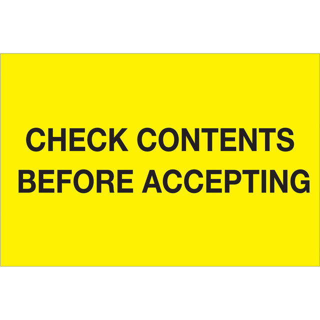 4 x 6" - "Check Contents Before Accepting" (Fluorescent Yellow) Labels