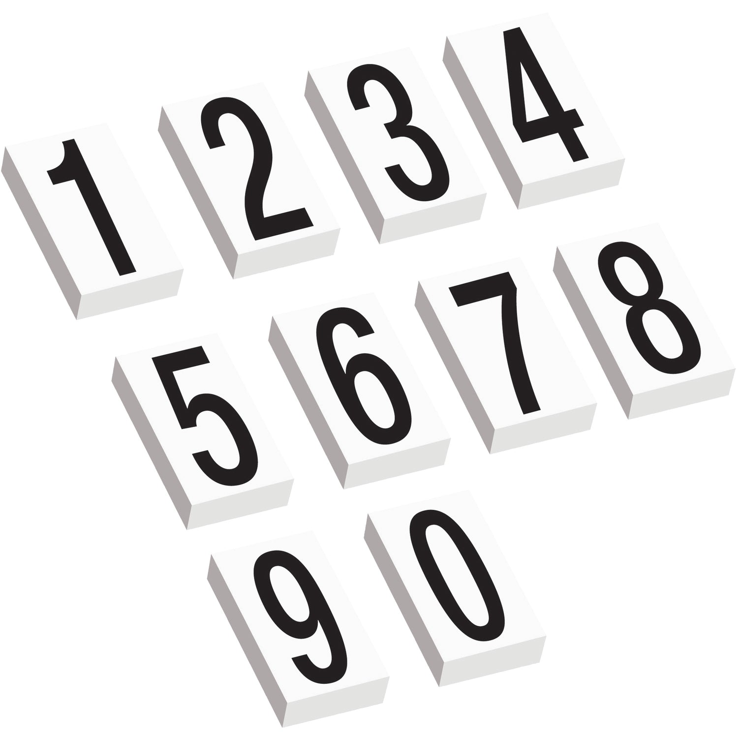 Strong, permanent adhesive backed vinyl labels. All labels are 3 1/2". Kit includes: 100 each of numbers 0 and 1. 50 each of numbers 2-9.